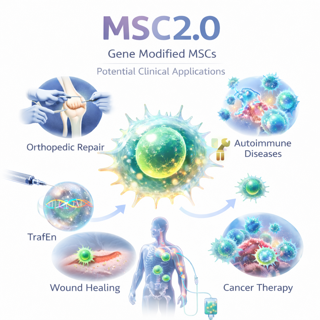 TrafEn, our proprietary non-viral gene delivery platform, enables precise and efficient engineering of MSCs without reliance on viral vectors. By using TrafEn to program MSCs to express defined therapeutic proteins at controlled and functional levels, we can tailor cell-based therapies to specific disease contexts. This capability underpins our MSC 2.0 approach—transforming native MSCs into programmable, next-generation therapeutic cell products.